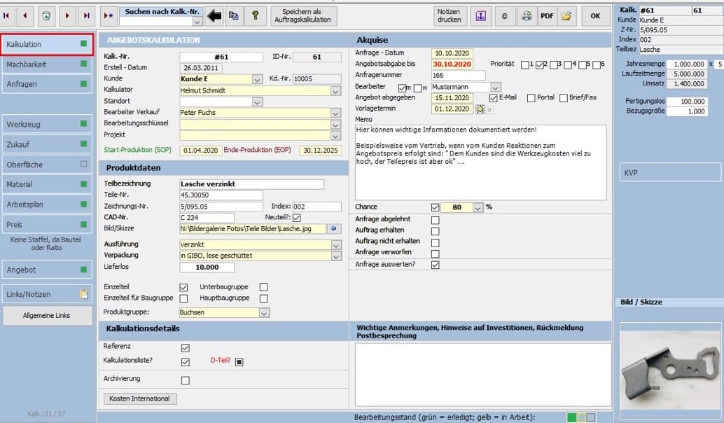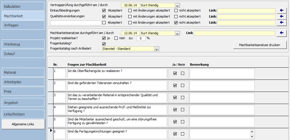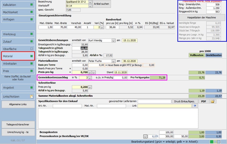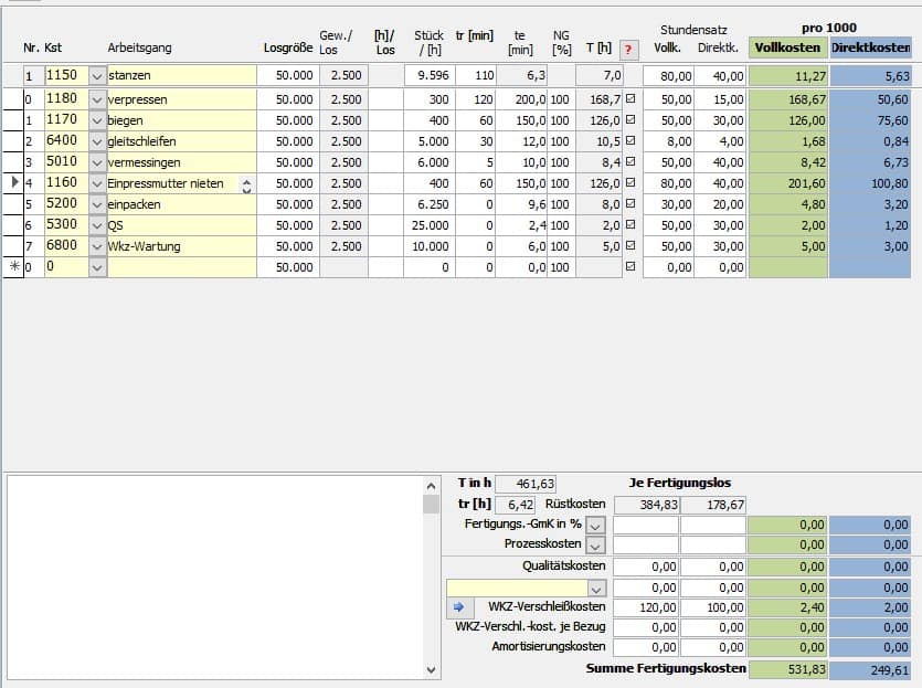 In the form work plan the individual operations are entered and displayed as parallel calculation (comparison of full costs and partial costs). The order time (ta) of the operation “punching” is precisely determined by the entries in the green field (strokes per minute).