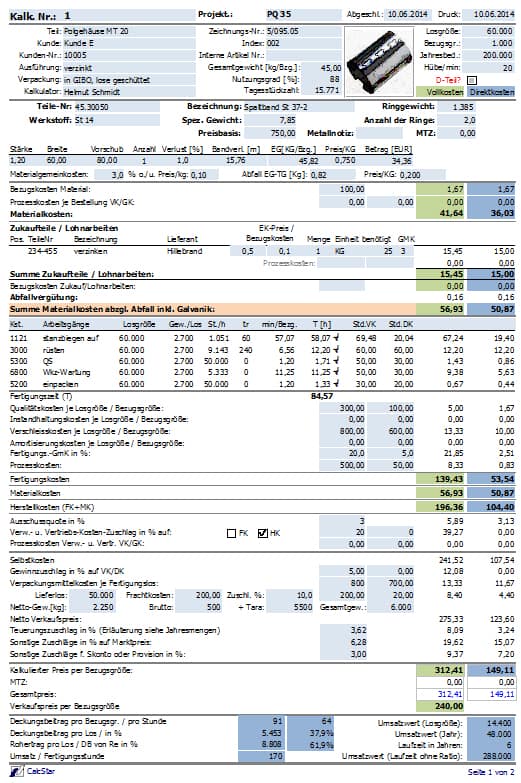 The costs and prices determined according to the principle of surcharge calculation and contribution margin calculation are displayed in the right columns as parallel costing. The most important business ratios (contribution margin / h, total contribution margin …) are displayed in the lower area of the costing printout.