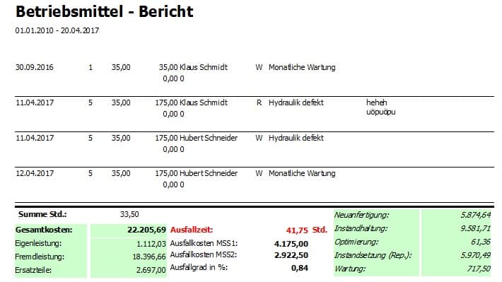 - Maintenance cost and downtime determination (MTBF / MTTR) for all equipment