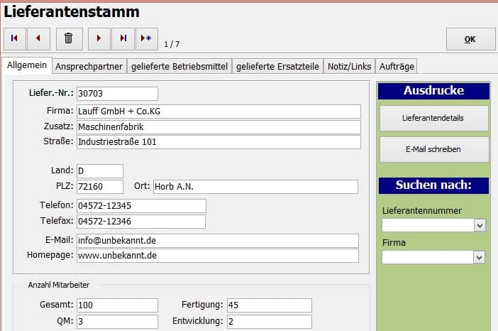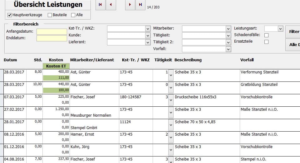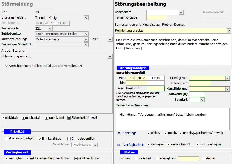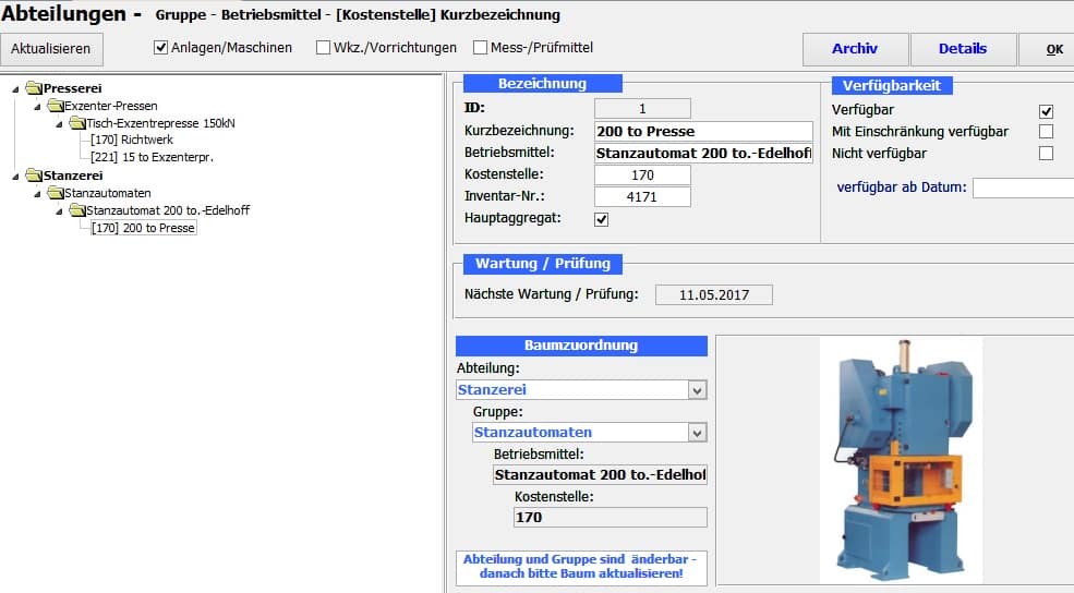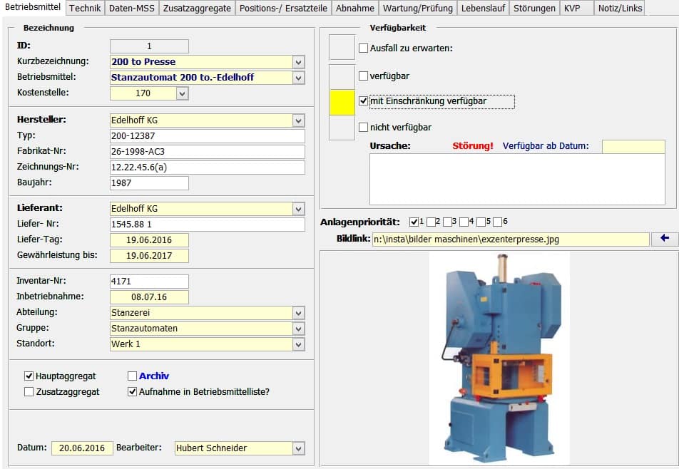 Essential characteristics and the availability of the equipment (here a 200 ton press”) are displayed here. On further tabs, important information can be stored, e.g. about the associated auxiliary units and spare parts (storage location, quantity, supplier, etc.) as well as detailed information on maintenance planning and inspections.